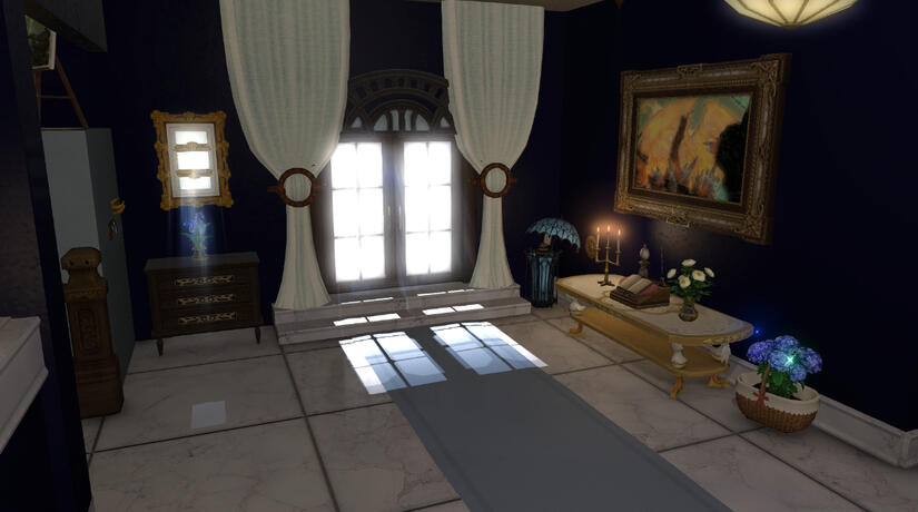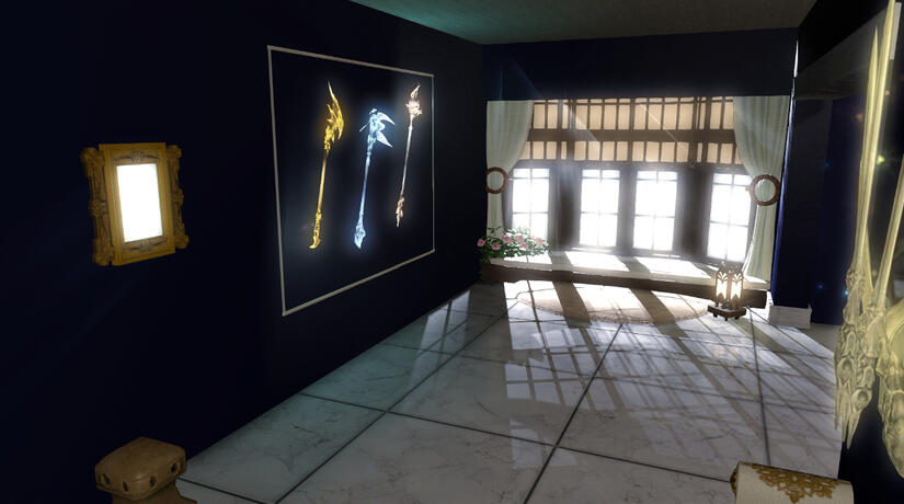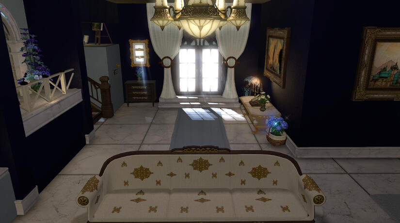 Excalibur | Mist Ward 21, Plot 14This is a build that I designed for an FC! The owner requested a modern, spacious, and luxurious feel, with a color palette consisting of white and her signature midnight blue, with plenty of gold accents interspersed throughout. The owner specifically wanted to aim for a house where her friends and FC mates could lounge and relax together. Special elements were added upstairs - namely a closet, vanity area, gpose studio, and a wall display for her fancy ultimate weapons.