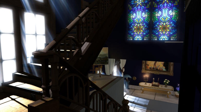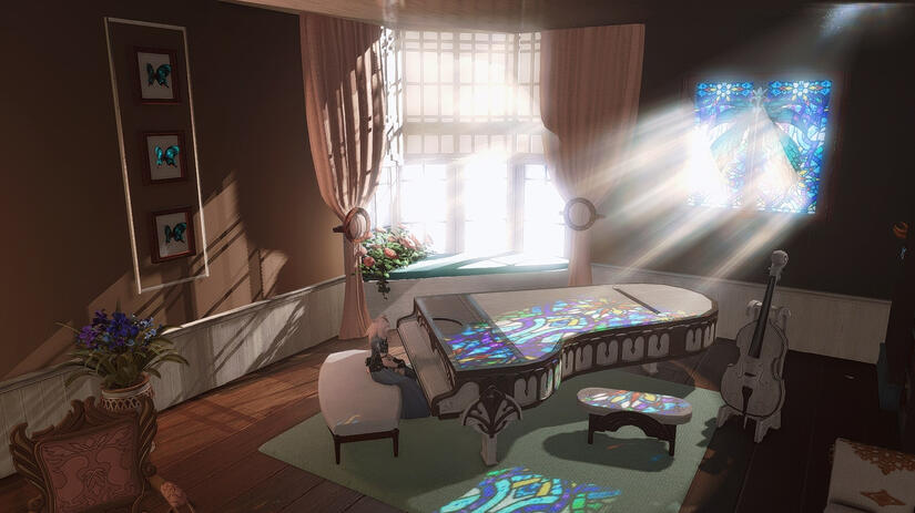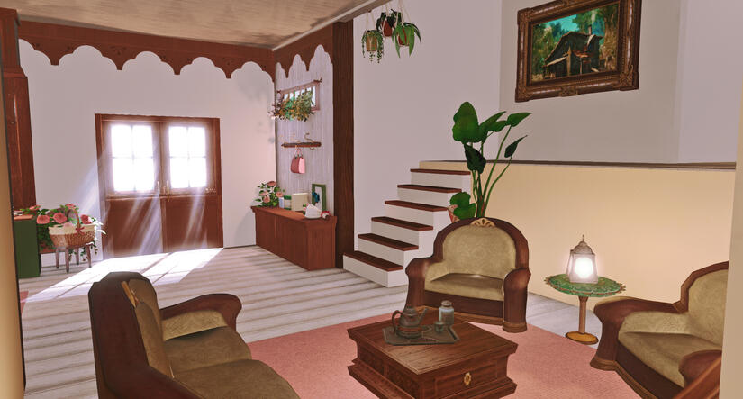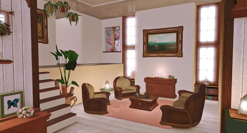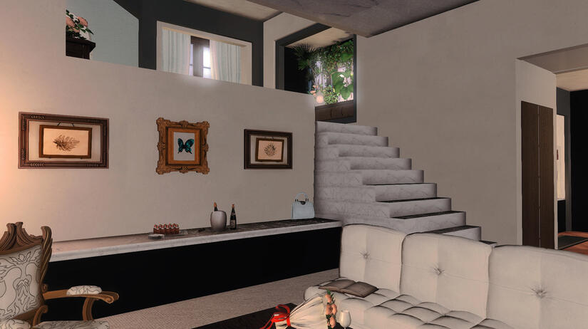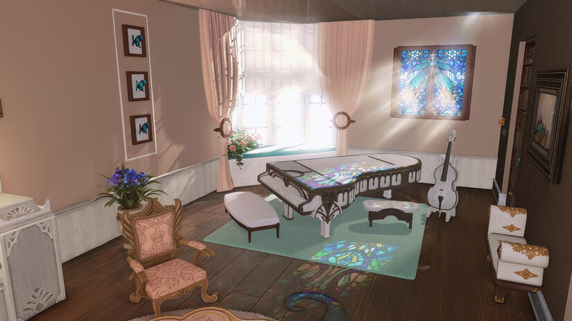 Lamia | Lavender Beds Ward 24, Plot 36My current personal home design, decorated to my whims and fancies. Originally this was just going to be a small and simple sitting room - a resting area between raids for me and friends. But then I had an idea for this winding set of stairs... and things took off from there.
