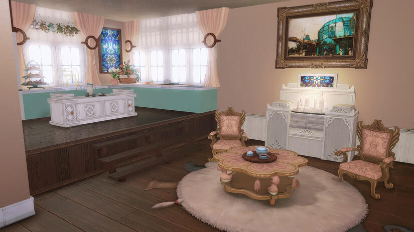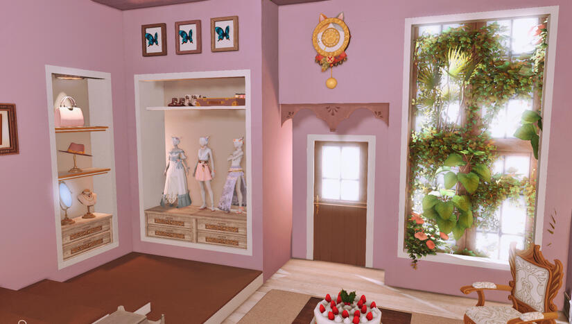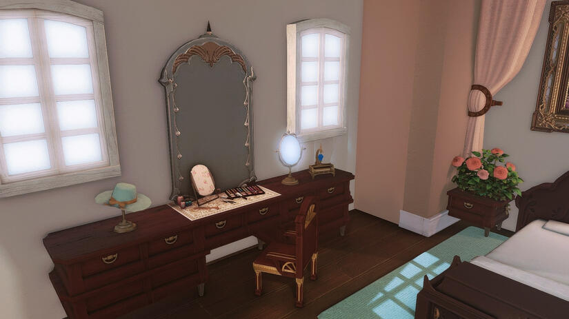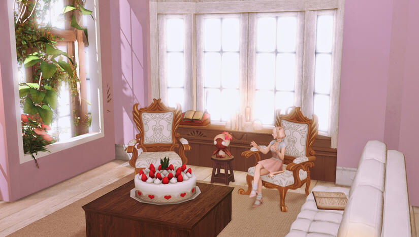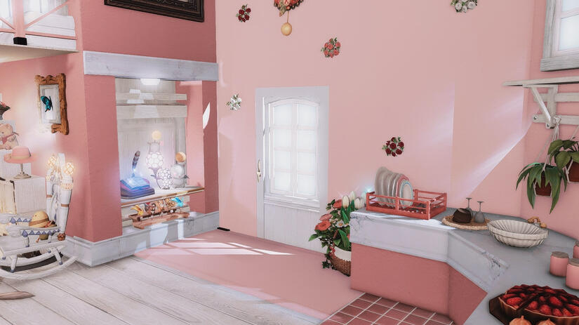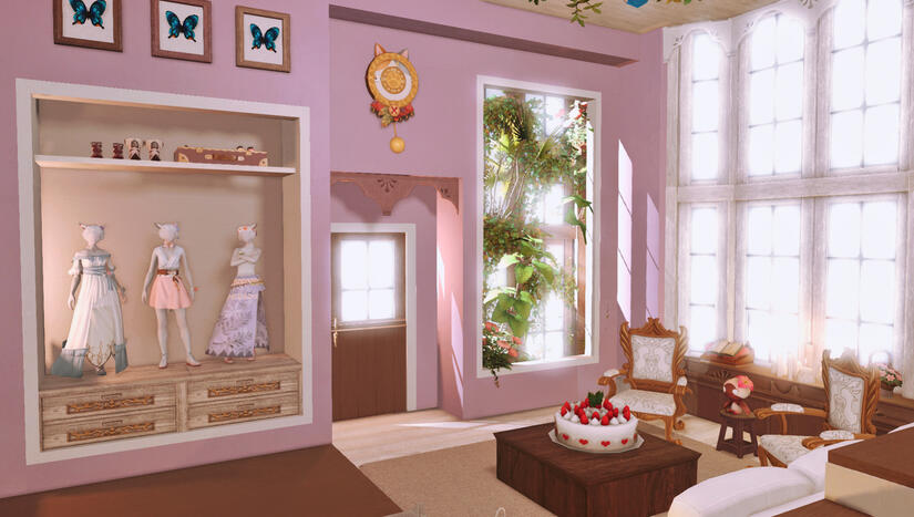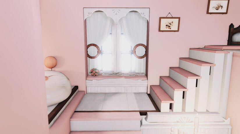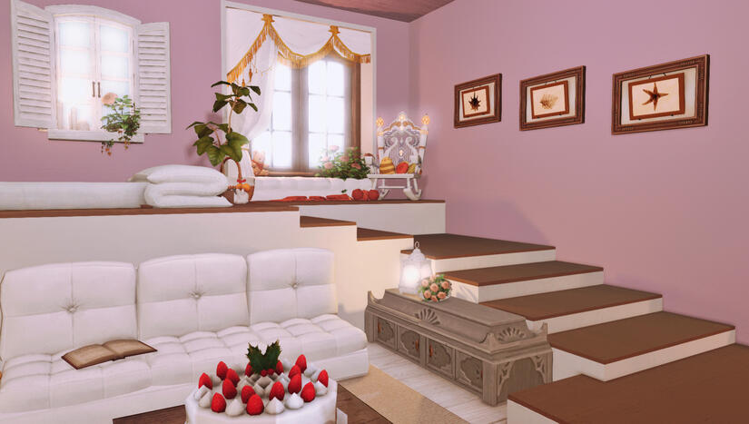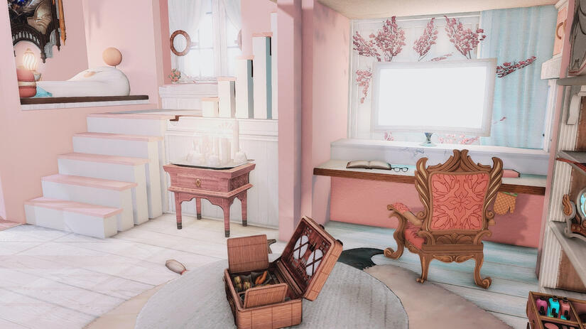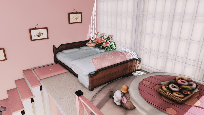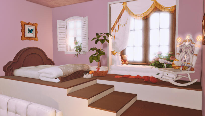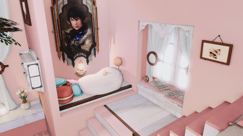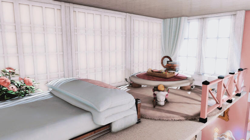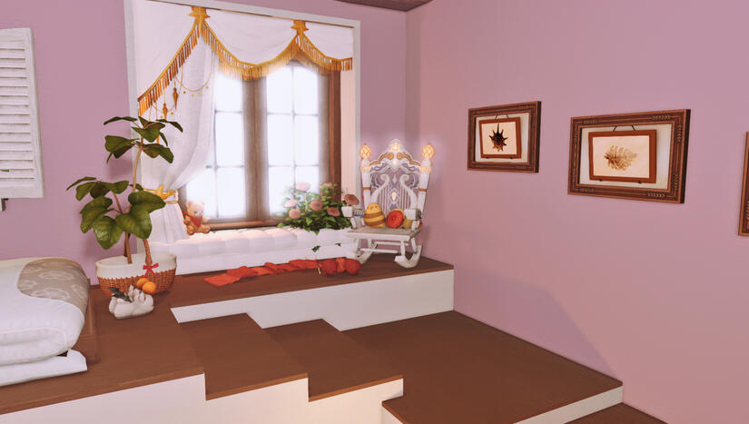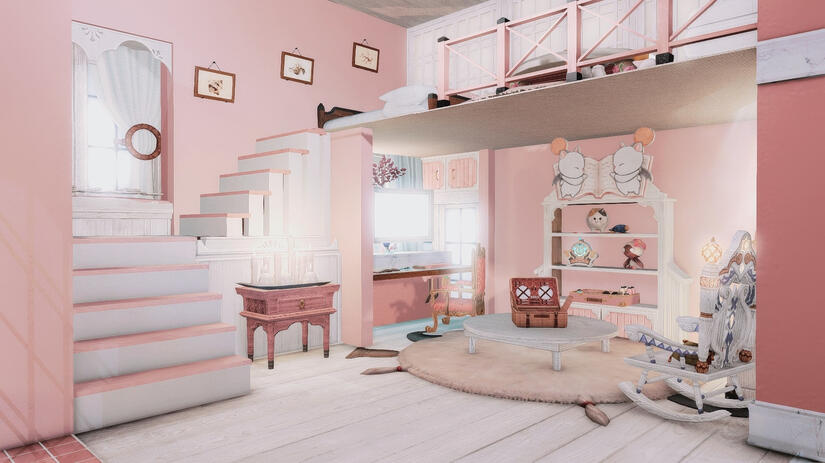 Lamia | Mist Ward 2, Plot 19This is a one-floor build in a small home, with a lofted bed area, a few window nooks, a gaming desk, and a special shrine to admire a crush. The owner is a lover of all things cute and girly, so the home was painted in the colors of pink and white, and filled with flowers, Moogles, and plenty of stuffed animals and figurines.