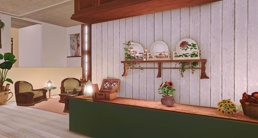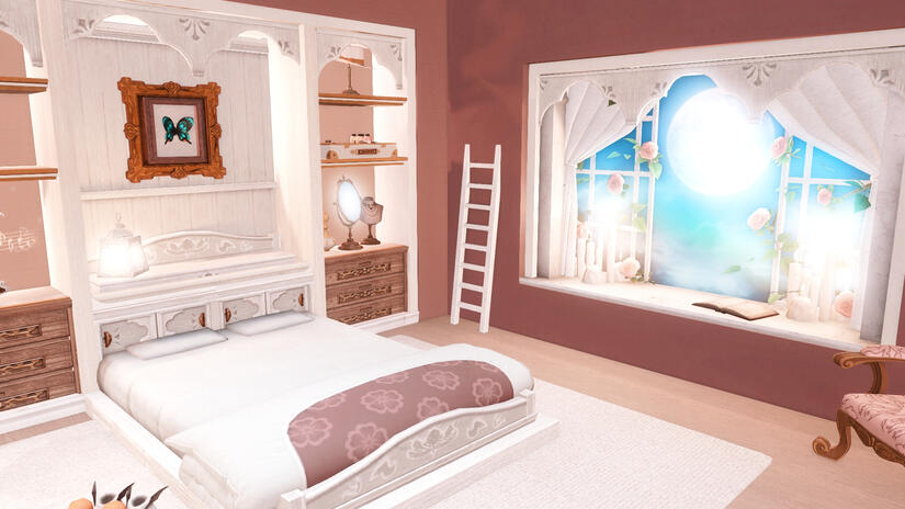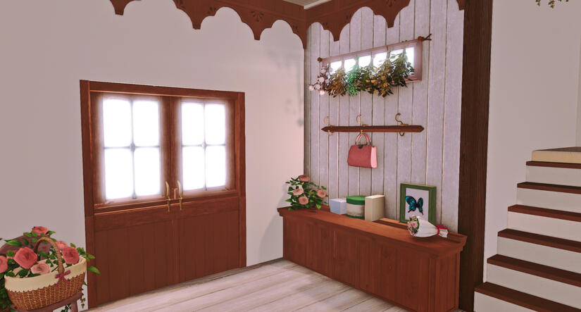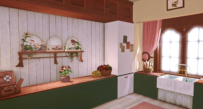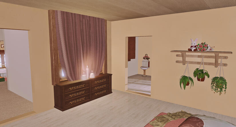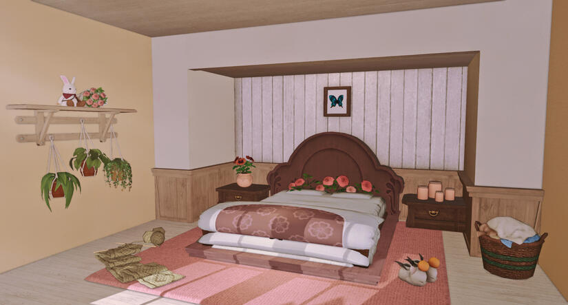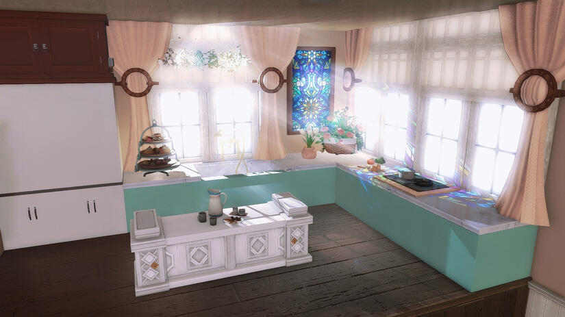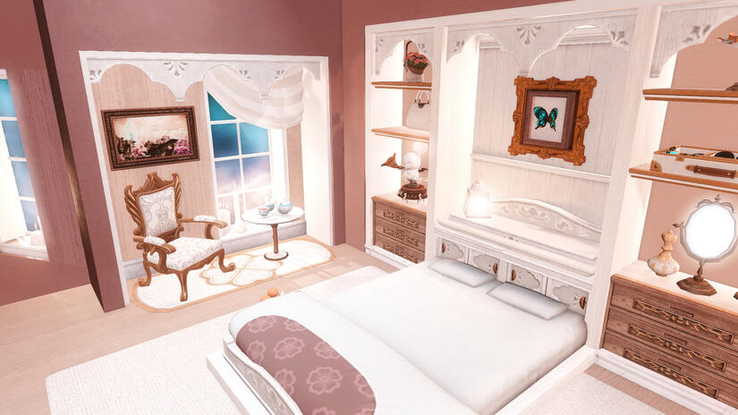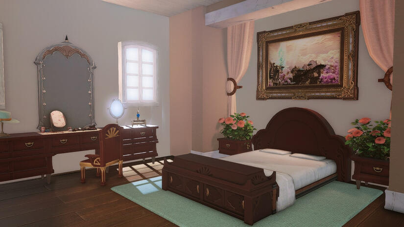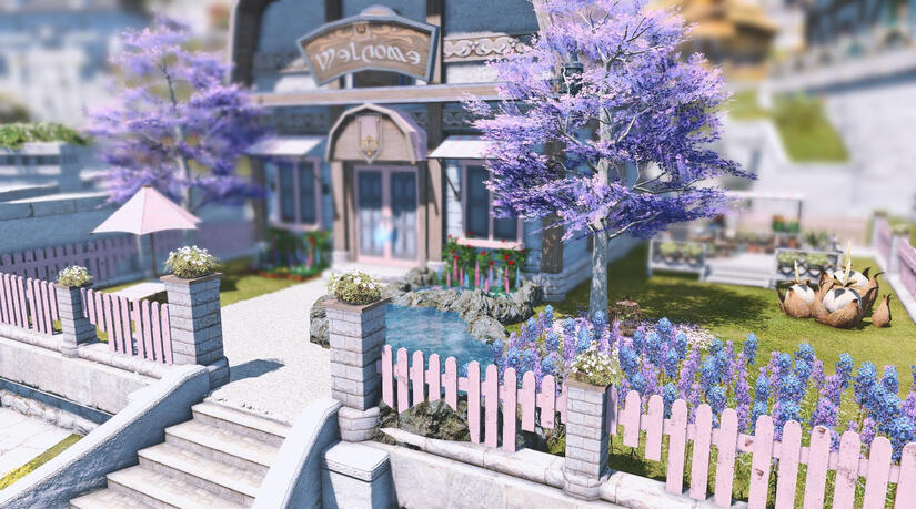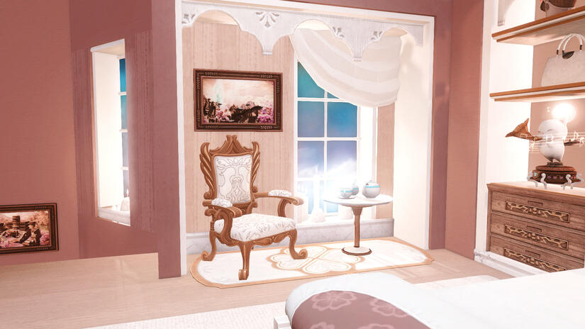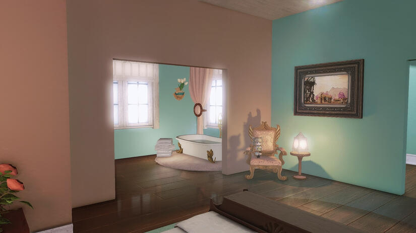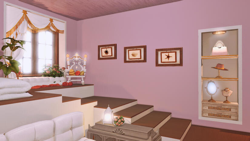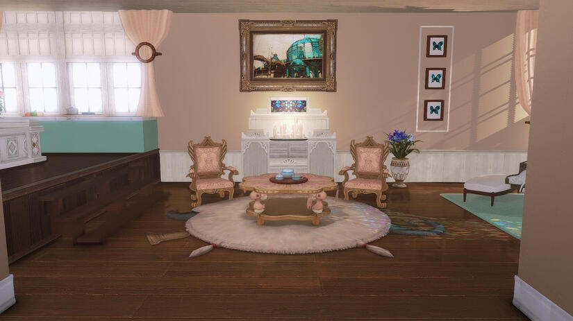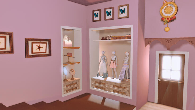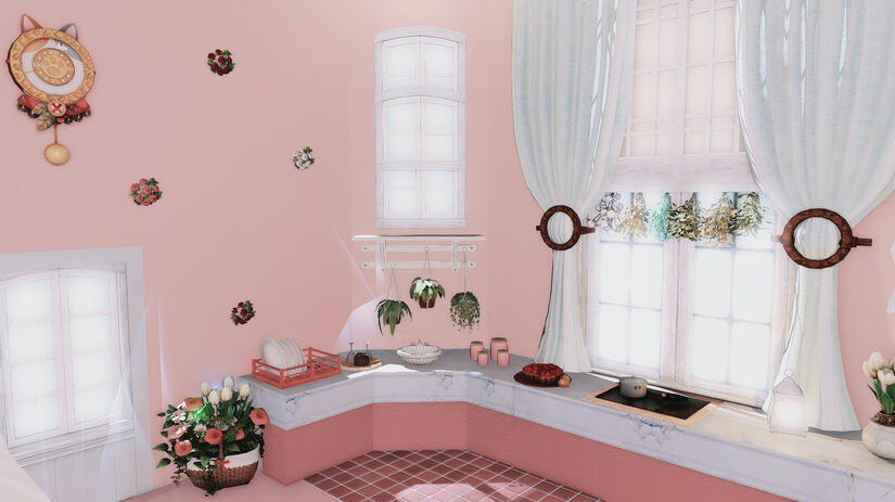 Lamia | Mist Ward 2, Plot 19This is a one-floor build in a small home, with a lofted bed area, a few window nooks, a gaming desk, and a special shrine to admire a crush. The owner is a lover of all things cute and girly, so the home was painted in the colors of pink and white, and filled with flowers, Moogles, and plenty of stuffed animals and figurines.