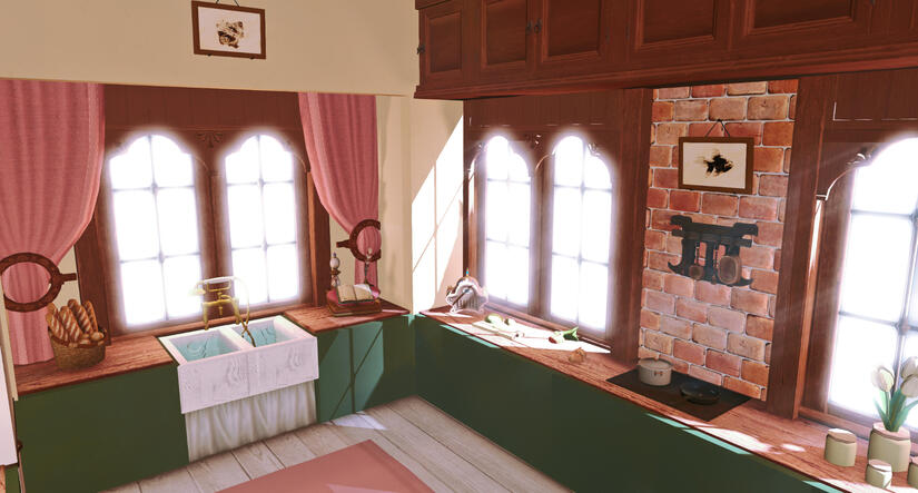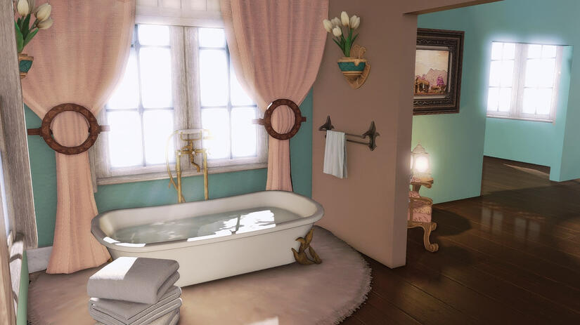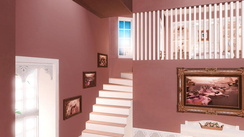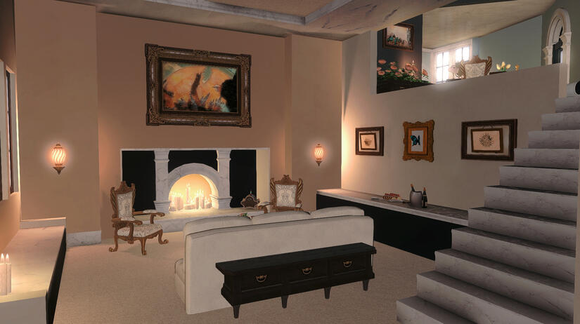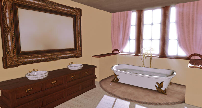 Behemoth | Goblet Ward 18, Plot 19I designed this house for a client who was looking for an elegant and spacious home fit for princess, with accents of teal and pink. It took me quite a long time to figure out what I wanted to do, but eventually I drew inspiration from Victorian decor and furnishings. This is a modern take on the Victorian style, with warm tones, feminine touches, and plenty of stained crystal accents.
